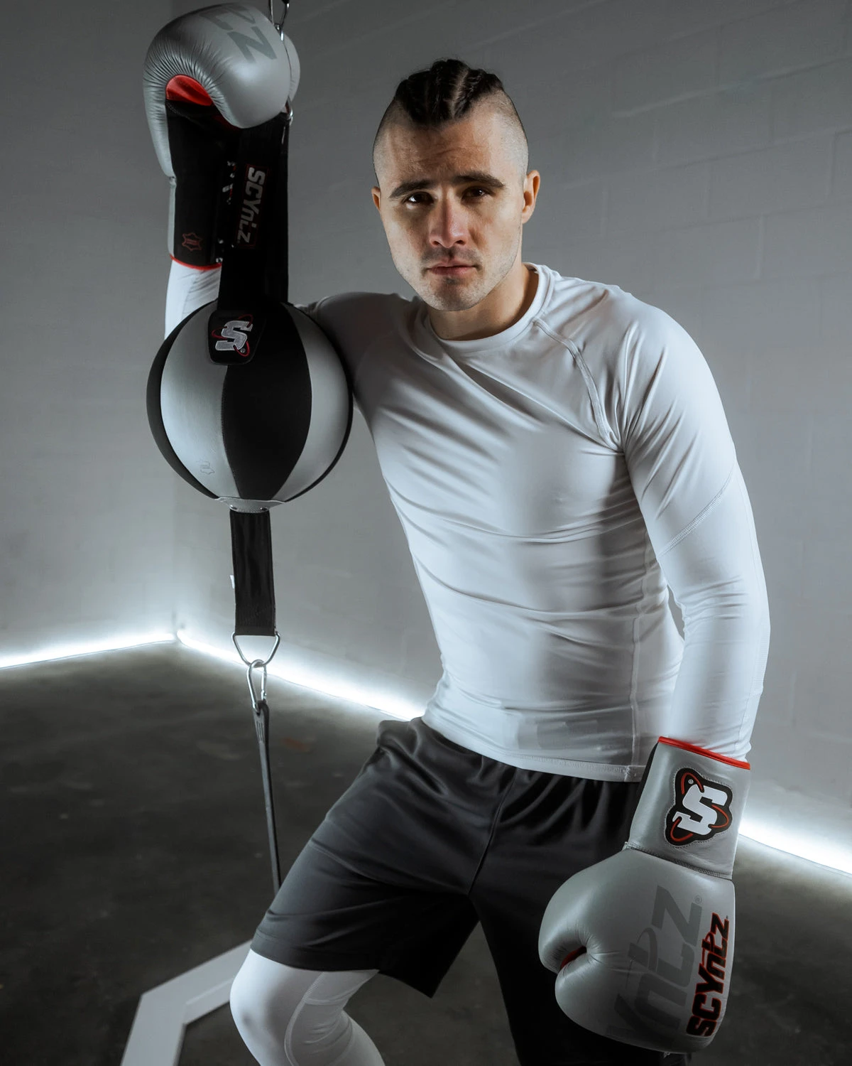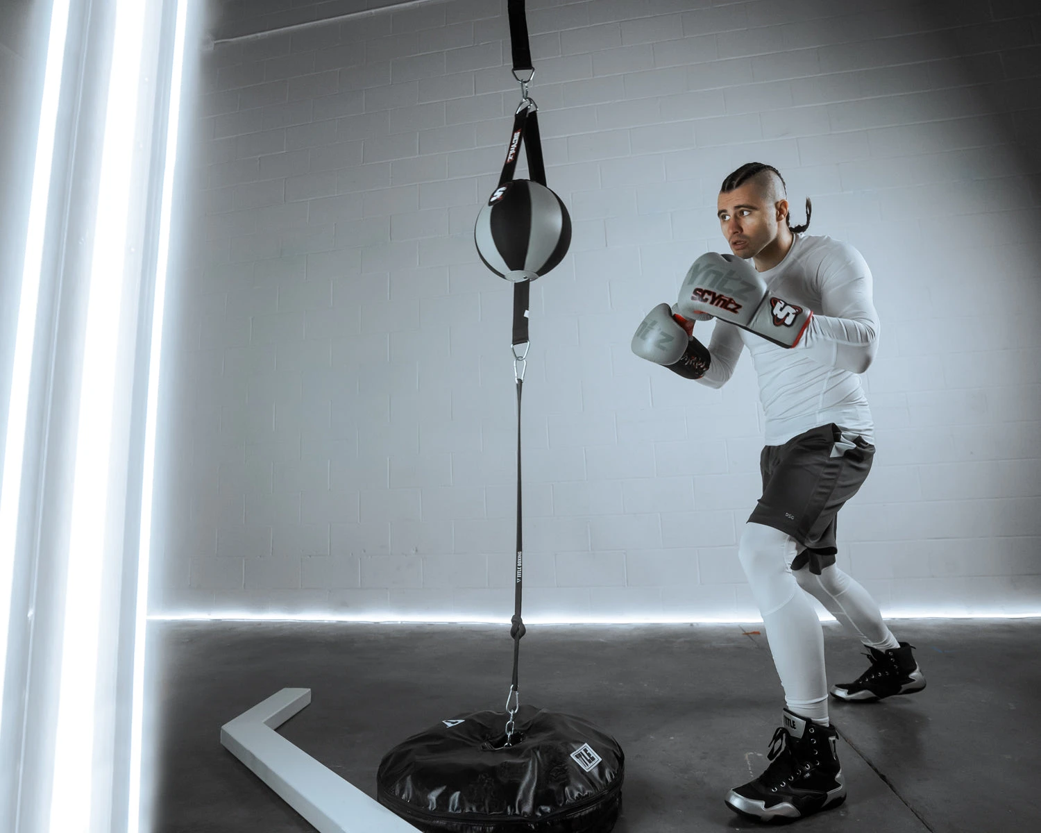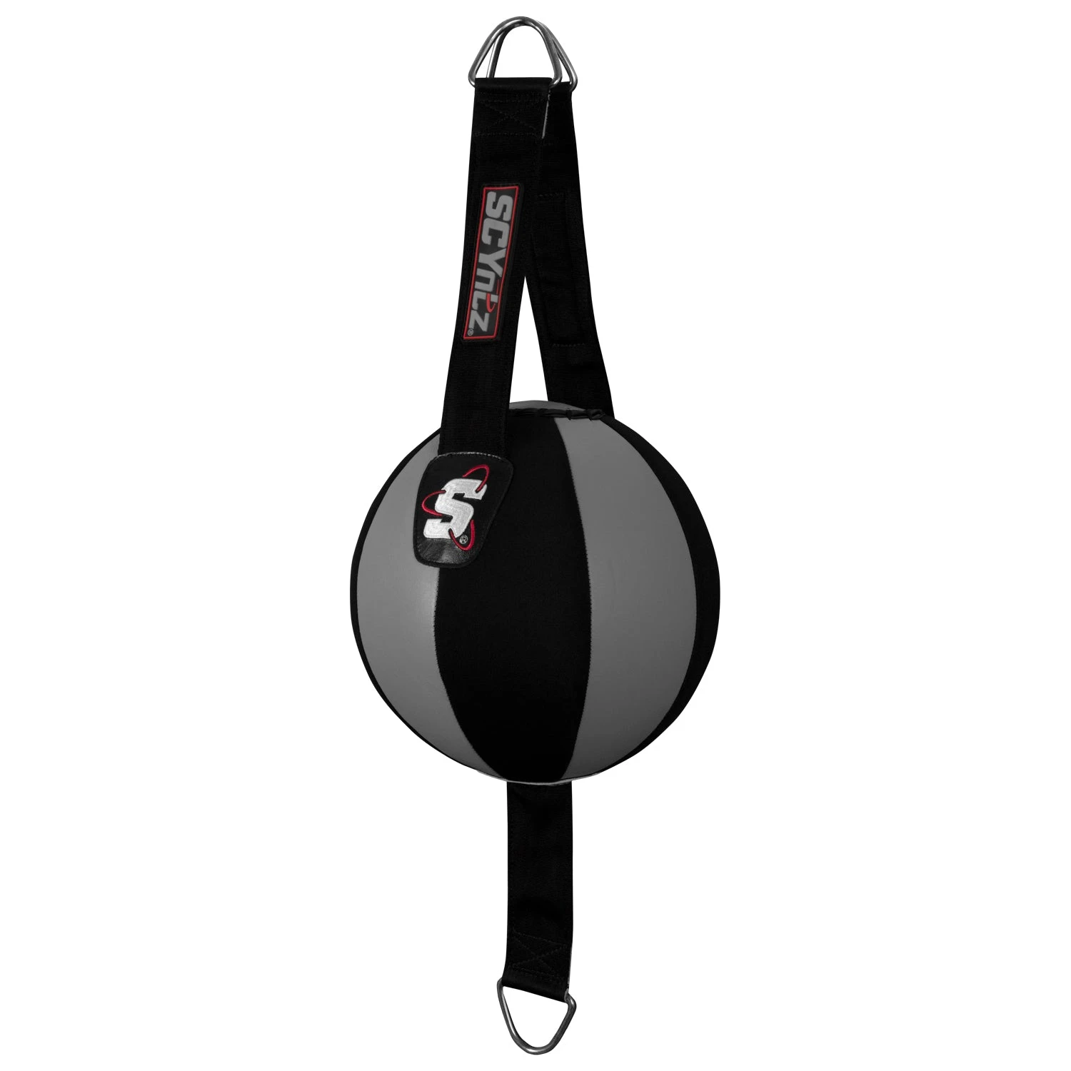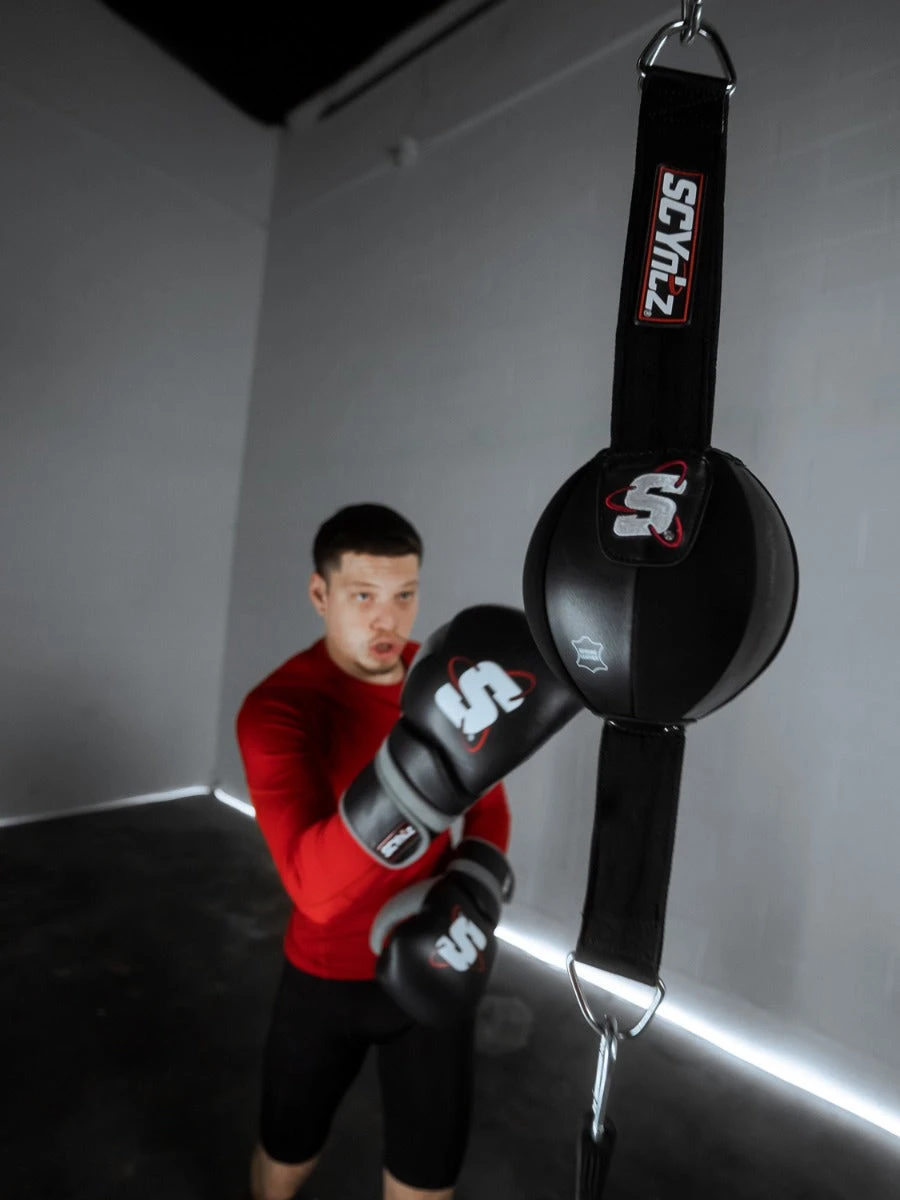 Step up your game with one of the best double end bags ever created. The SCYntz Leather Double End Bag is constructed from both genuine leather and neoprene to create one of the fastest double end bags that modern technology can produce. The bag is constructed from eight even panels to make sure that you have a perfectly round and well-balanced target no matter what angle you are at. The bag comes complete with a 36” rubber cable to secure the bottom of the bag, 11” dual straps on the top for balance and a 26” adjustable nylon strap attachment to make sure your bag – your opponent – doesn’t go anywhere. Offered in three sizes: Black – 6″, Red/Black – 8″ and Grey/Black – 10″